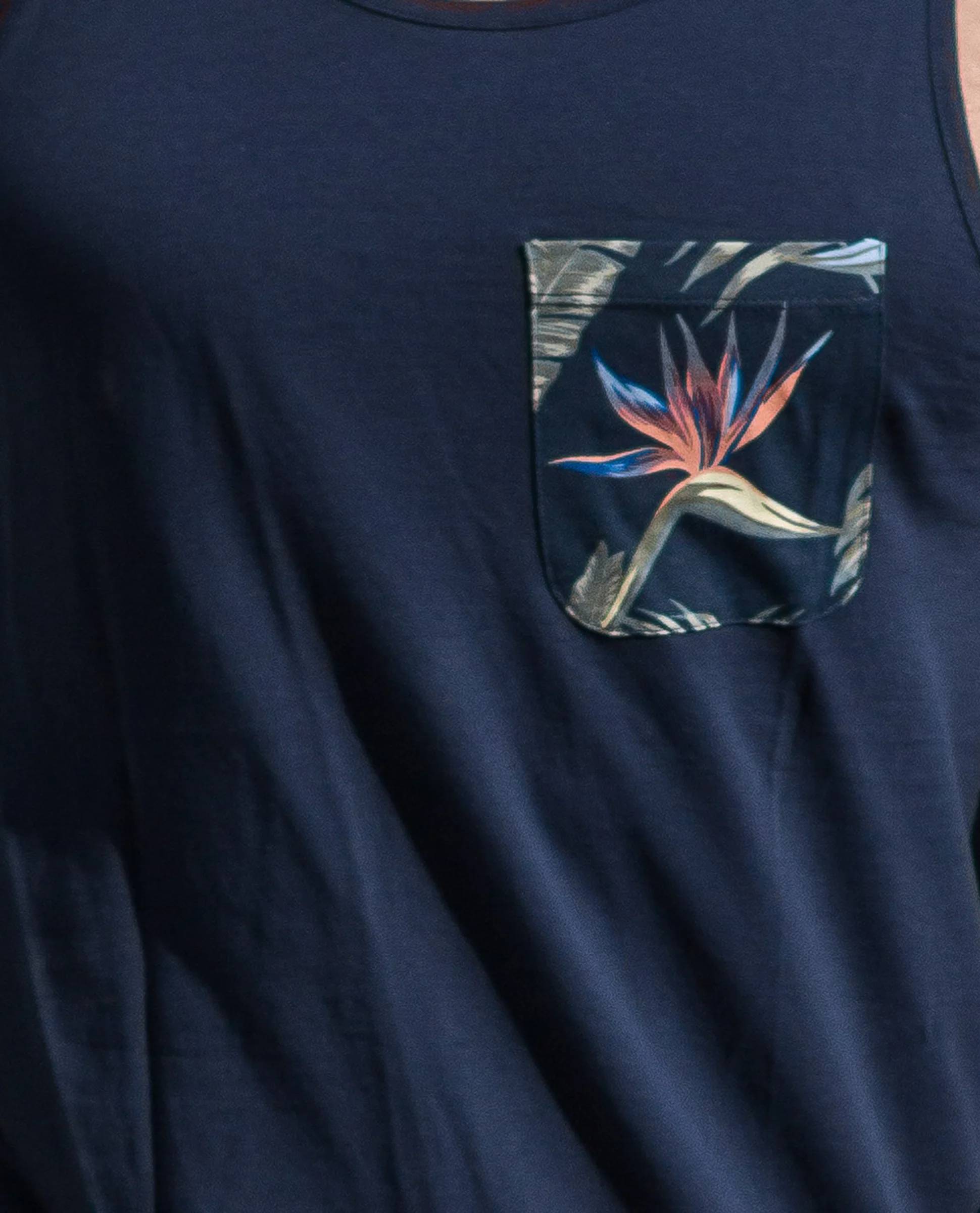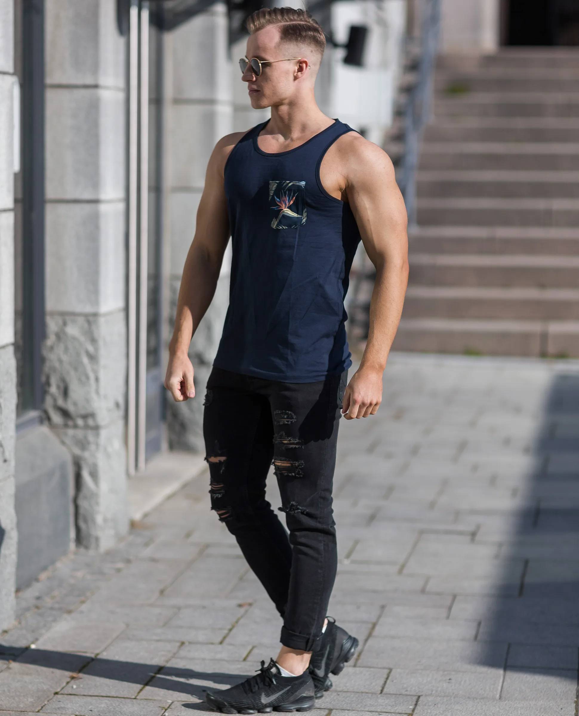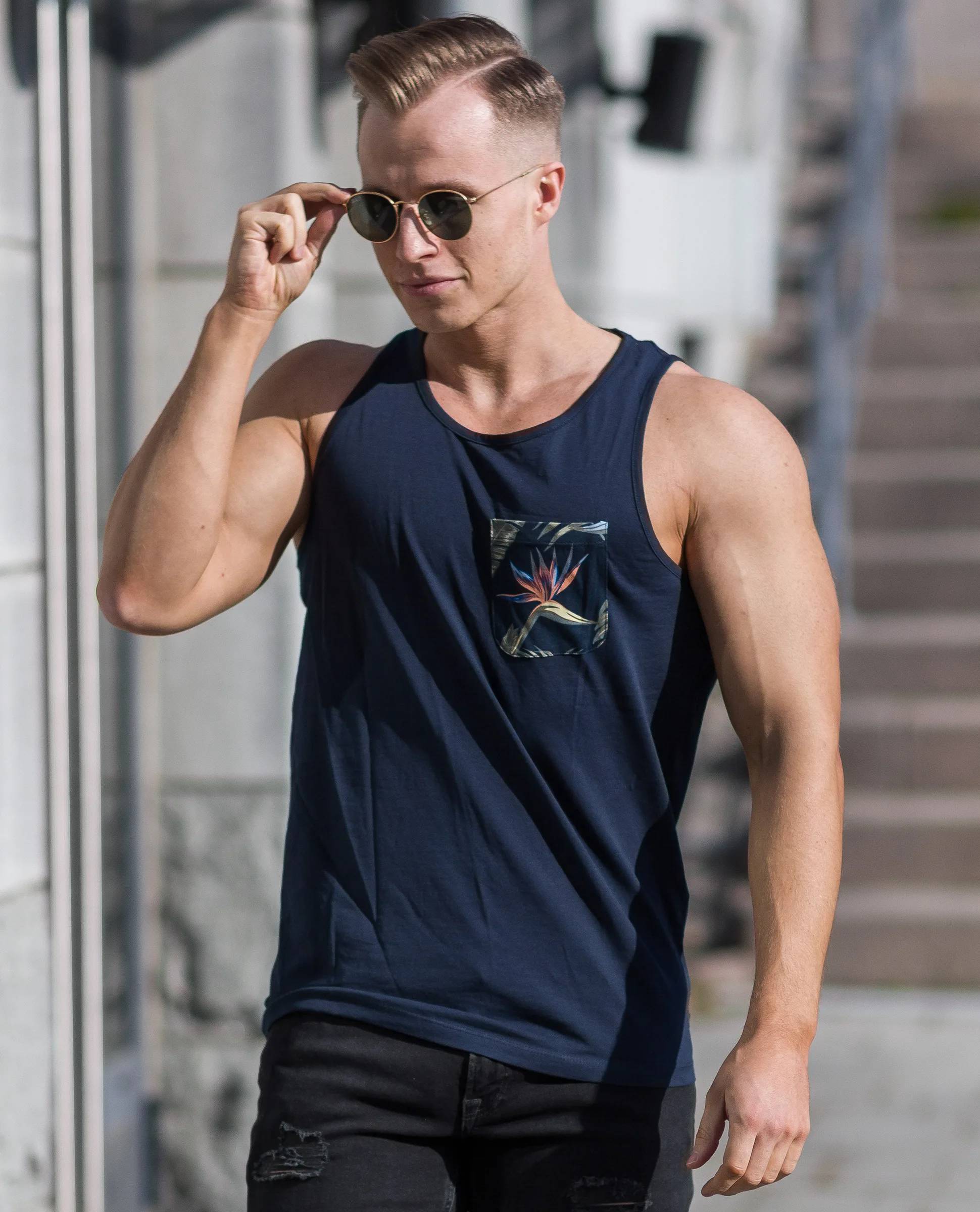 JACK & JONES mörkblå ärmlös. En enkel basprodukt för sommaren! Bröstficka, mönstrad. Casual snitt och passform.