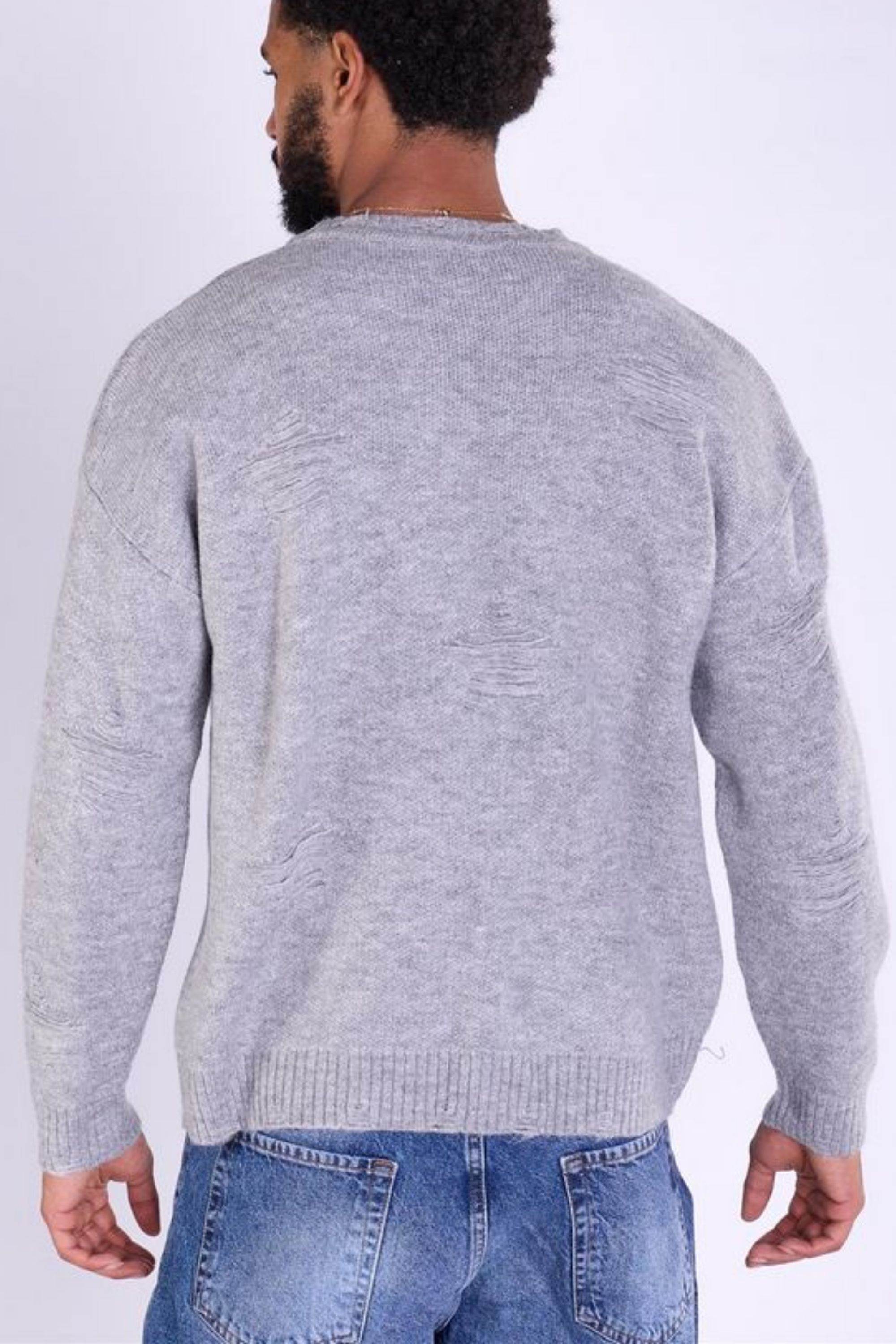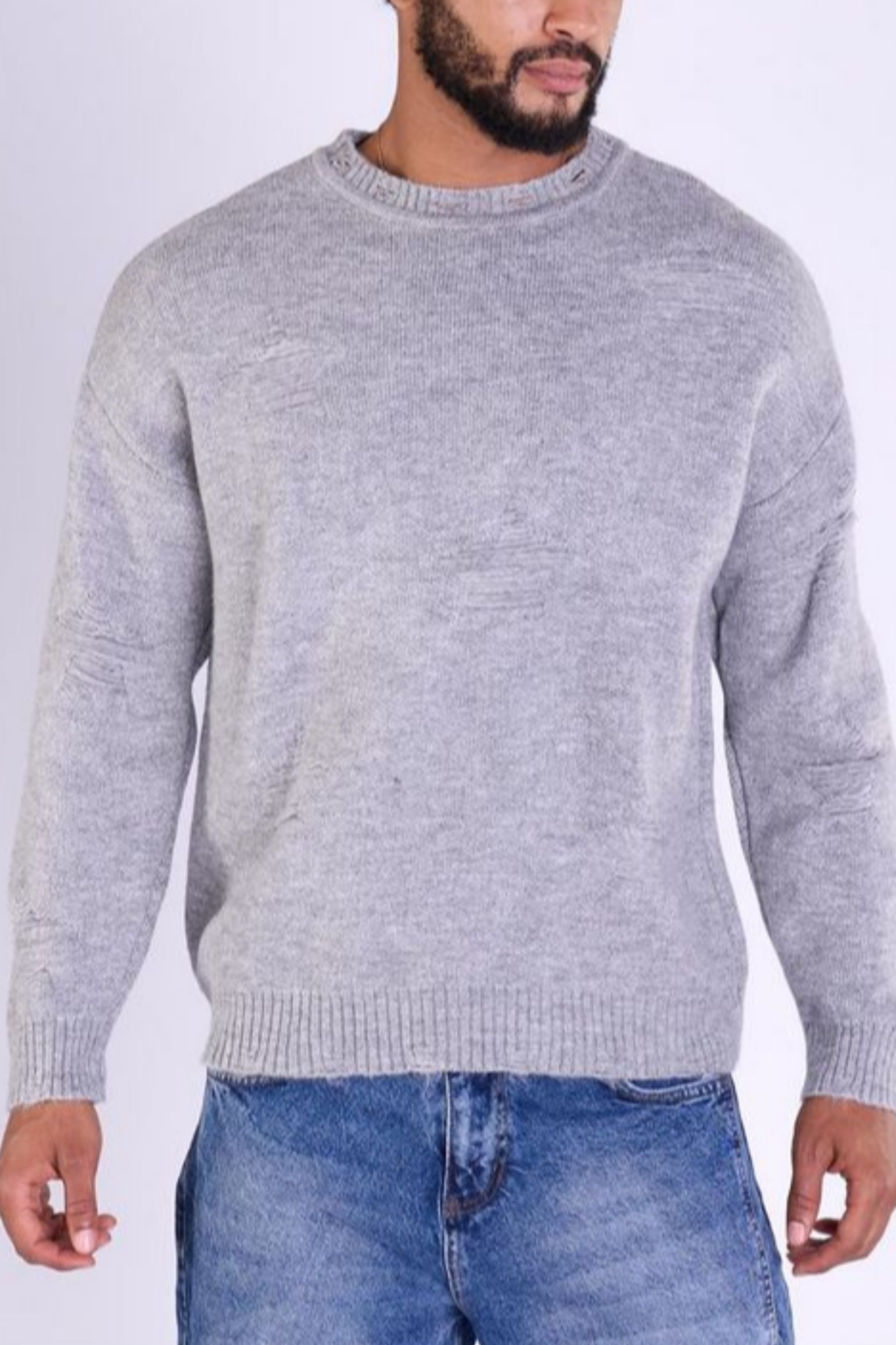 Mäns grå mjuka tröja med normal passform. Twist är en något bruten yta på kragen och på andra delar av tröjan, men den går inte igenom helt.