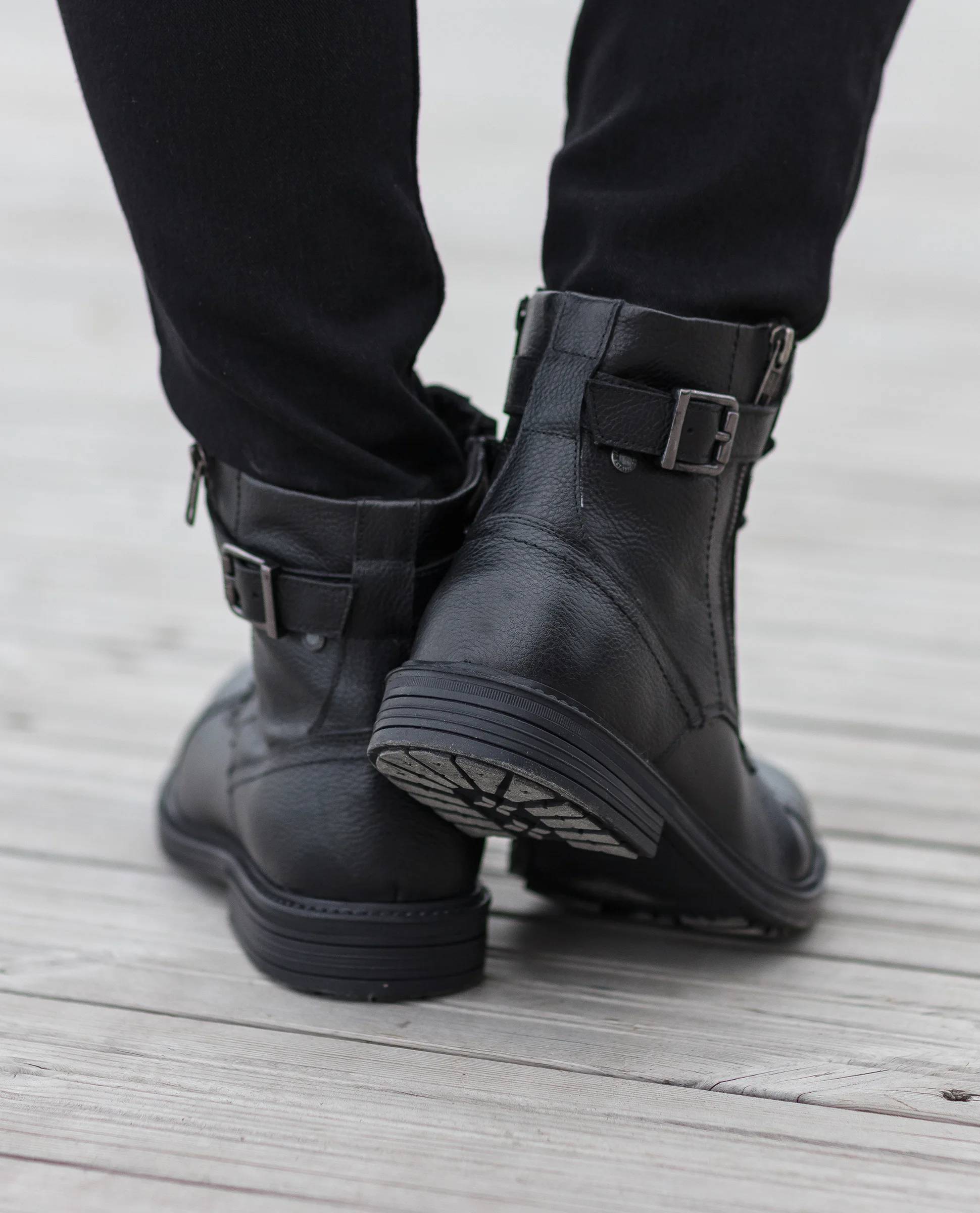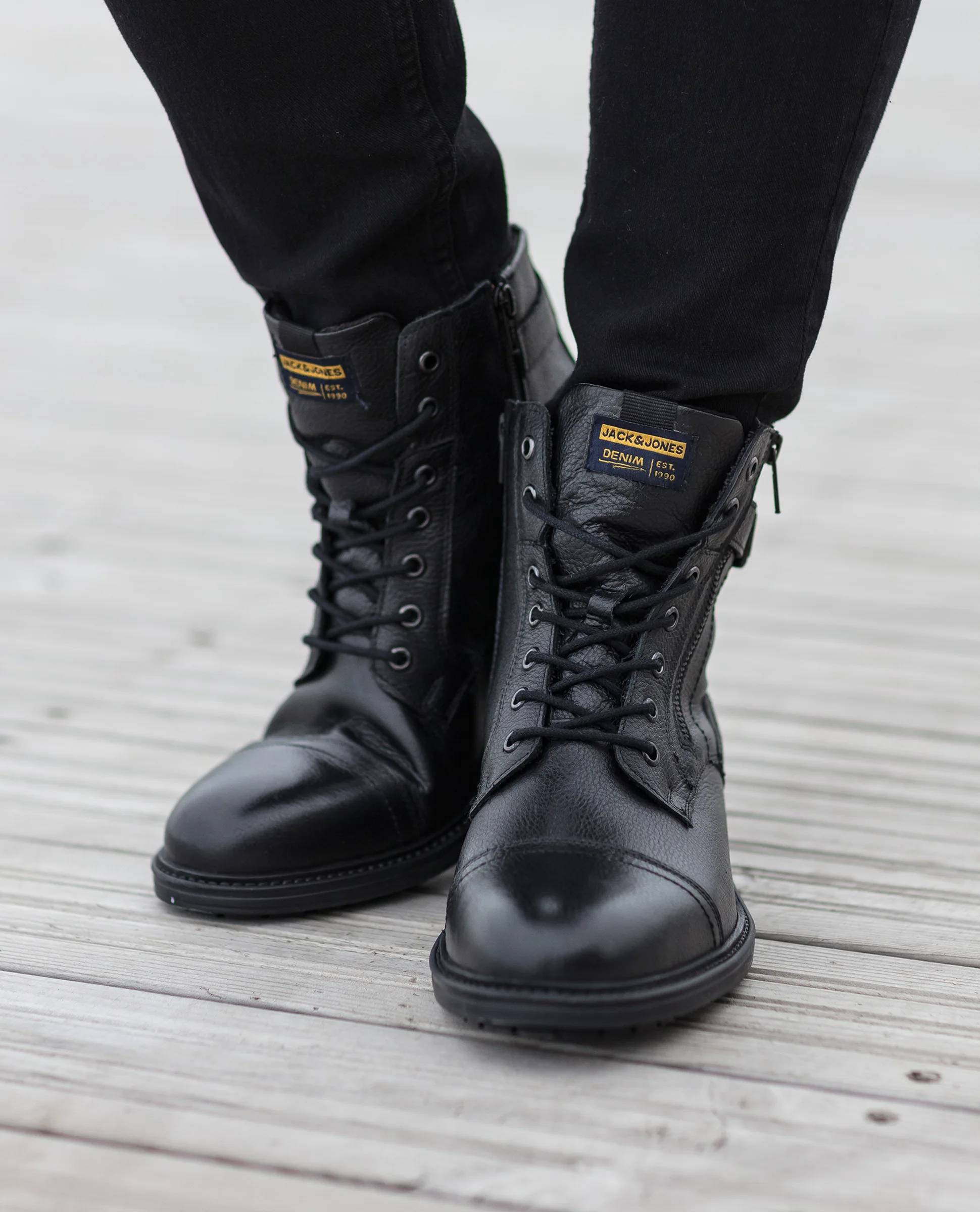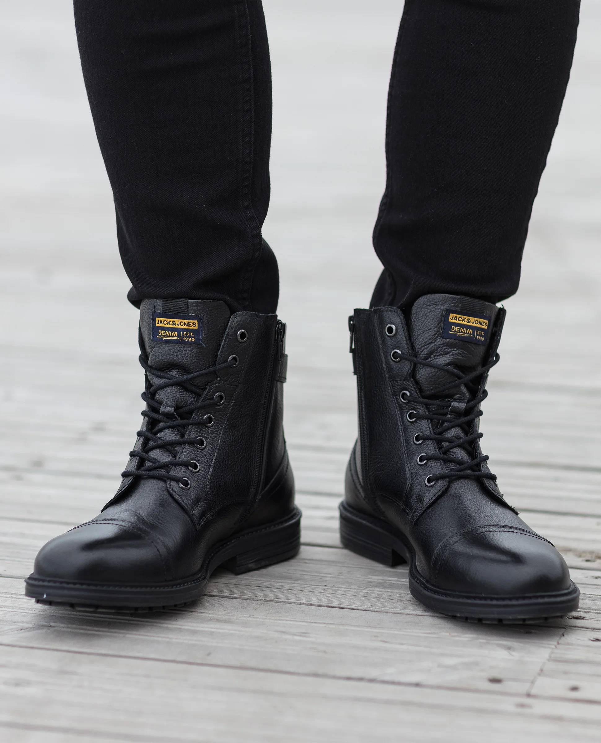 JACK & JONES stövlar i svart läder. Dragkedja, dekorativt spänne. Stabil bas. Ett trendigt val för hösten!
