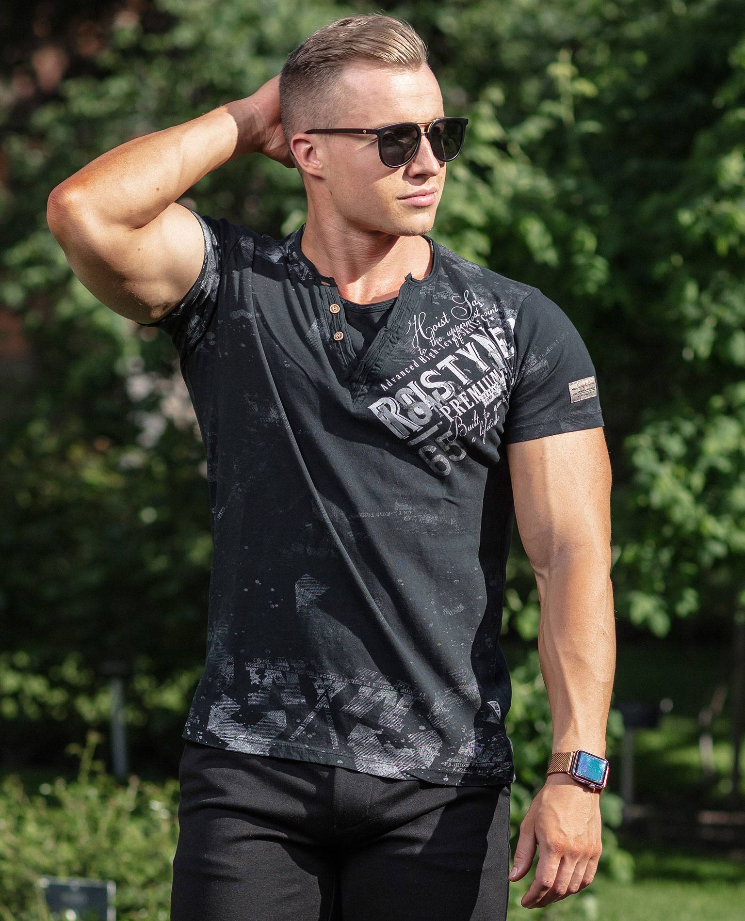 RUSTY NEAL svart t-shirt. Snyggt tryck på framsidan och ärmarna. Logotryck på ärmen. Dekorativa knappar vid halsringningen.