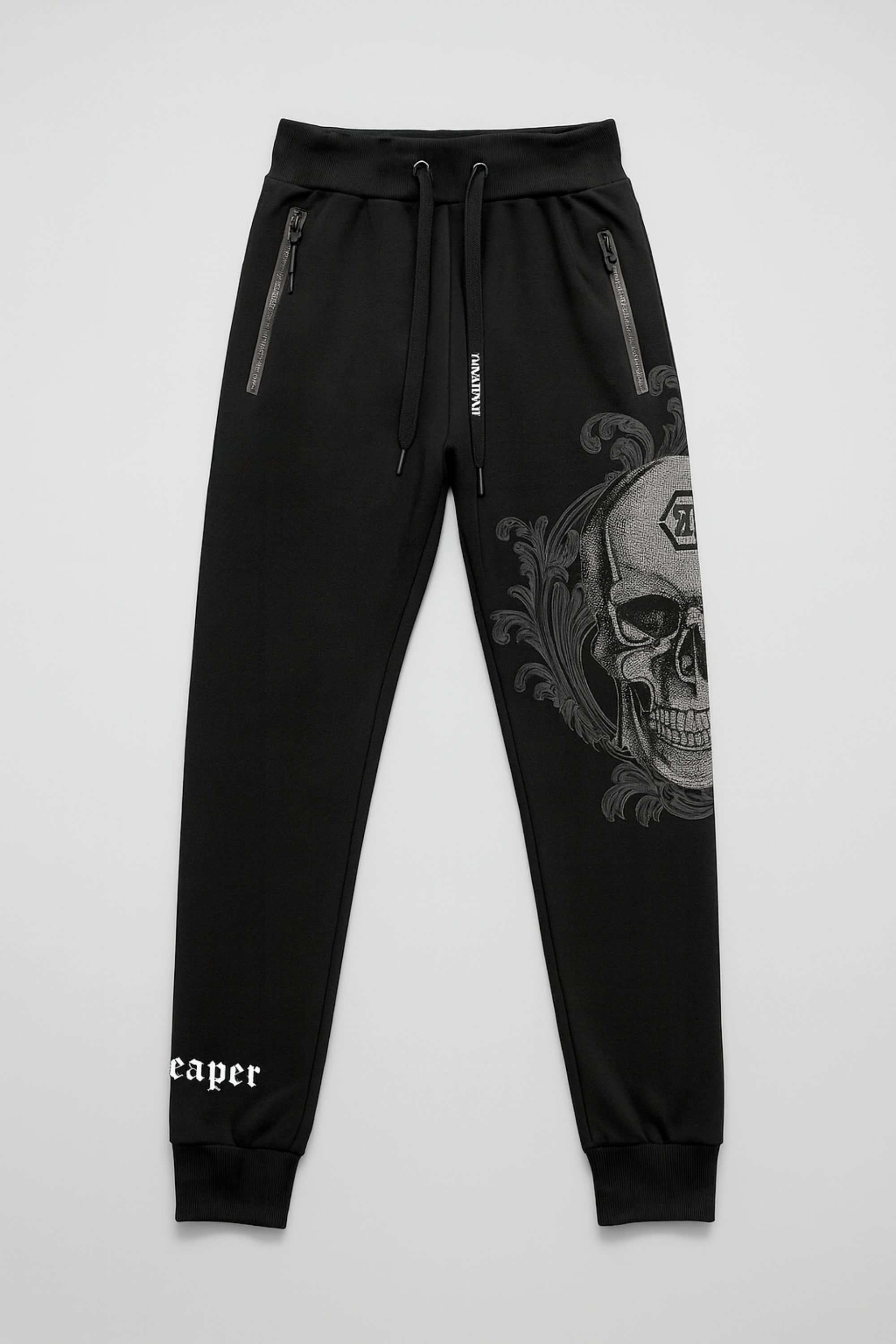 Svarta collegebyxor för män med iögonfallande strassdekoration. På lårets sida finns en strassprydd dödskalle som fortsätter på baksidan. Texttryck på ena muddbenet samt dekorativa sömmar. Två framfickor med dragkedja. Resår i midjan med dragsko. Resår i muddar.