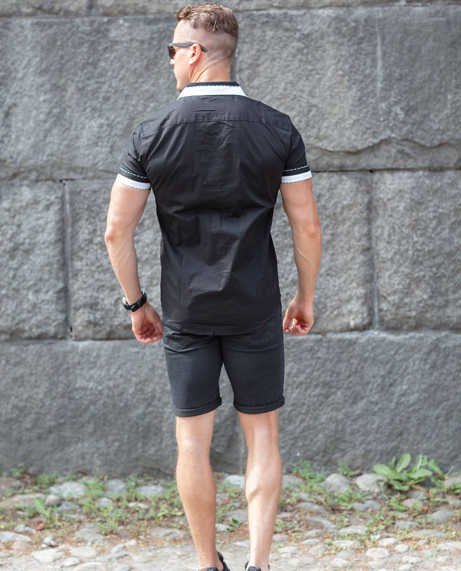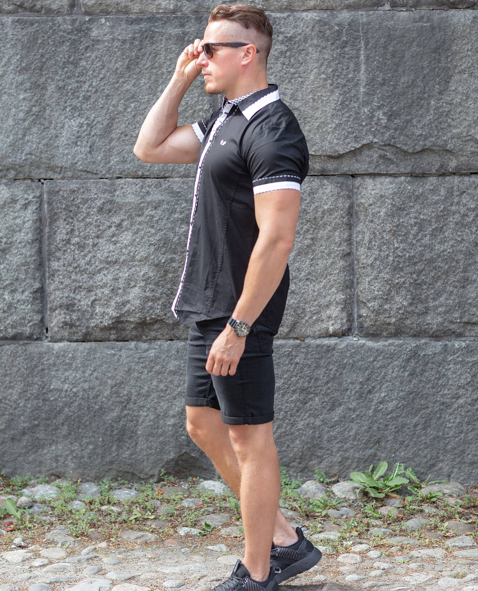 Svart kortärmad skjorta från Carisma med vita detaljer och knappar fram.