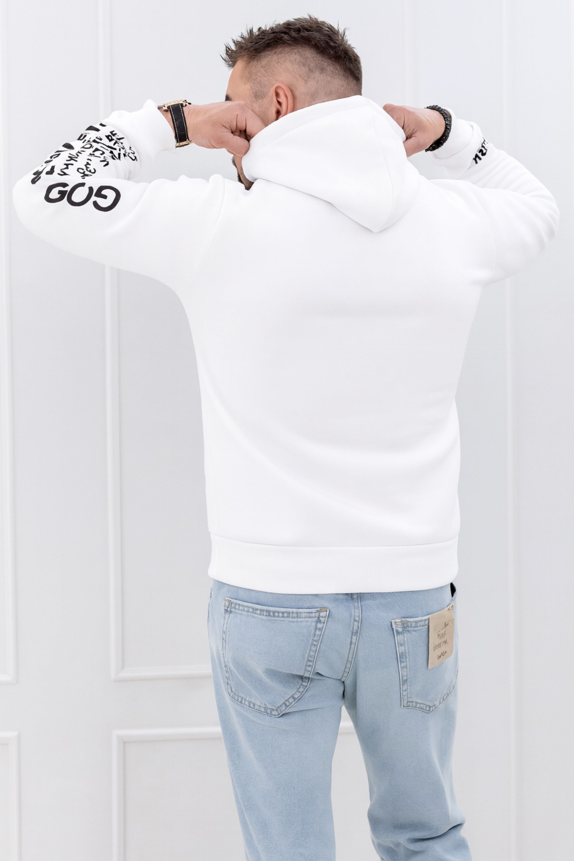 Vit hoodie för män från märket JERONE. Texttryck på bröstet och ärmarna. Mjukt material med borstad insida. Känguruficka, ribbade muddar vid fåll och ärmar. Dragsnören i huvan.
